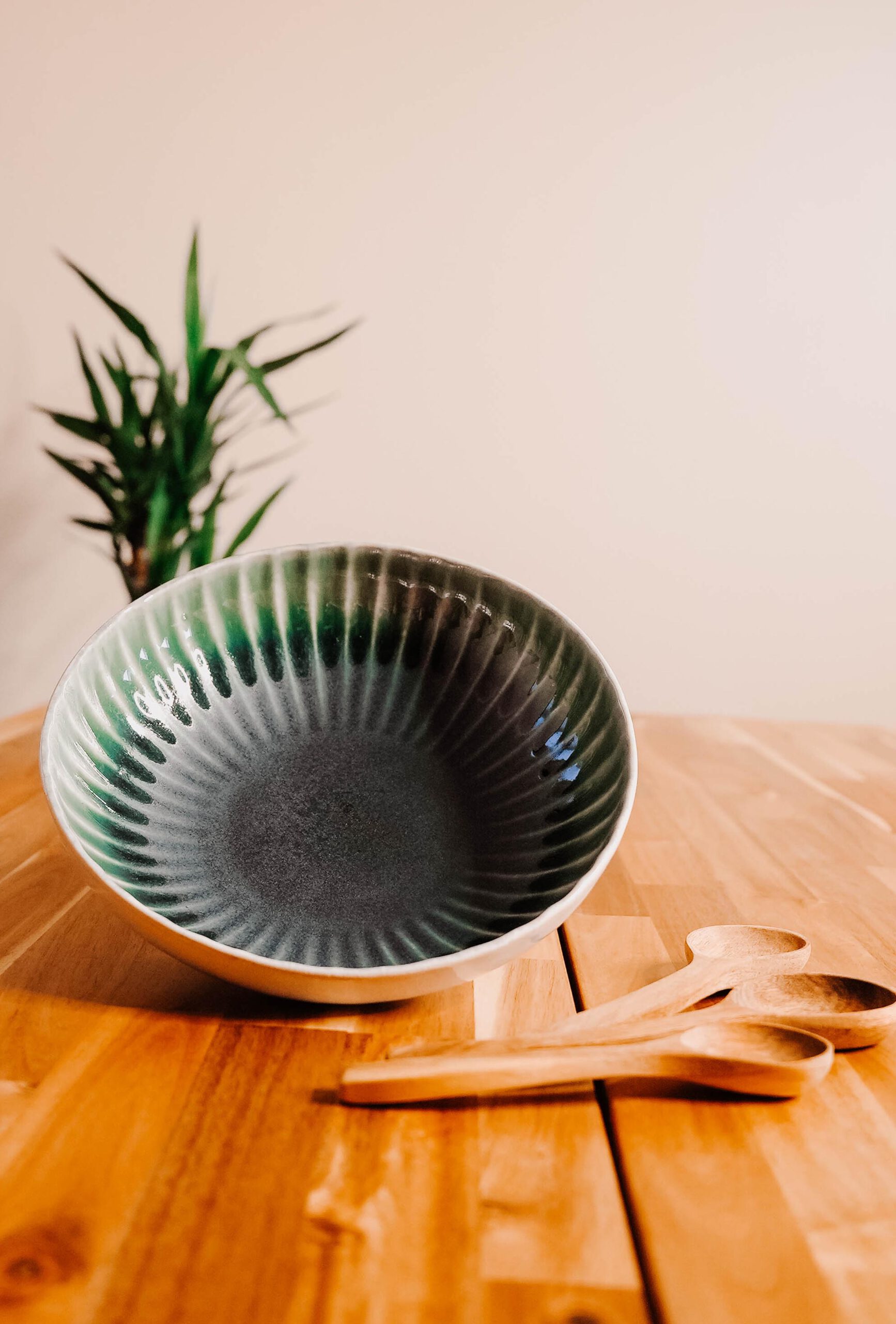 Este impresionante bowl de cerámica es una combinación perfecta de funcionalidad y diseño artístico. Con un interior esmaltado en un profundo tono verde que se difumina hacia el centro, y un exterior en un suave color beige, este bowl es ideal para quienes buscan añadir un toque de elegancia natural a su mesa. El acabado brillante del esmalte interior resalta la riqueza del color y añade una capa de sofisticación a la pieza.